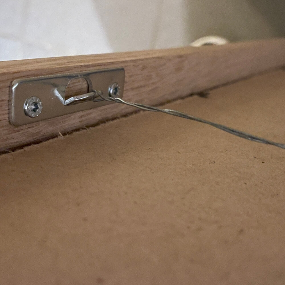 Bei Rahmen größer als 70x100 schicken wir auch immer zwei Bügel und eine Schnur mit, die Sie selbst an die Holzleisten schrauben können. Vor allem, weil es viel einfacher ist, die Schnur an der Schraube aufzuhängen - und dann brauchen Sie nur eine einzige Schraube in die Wand zu stecken.