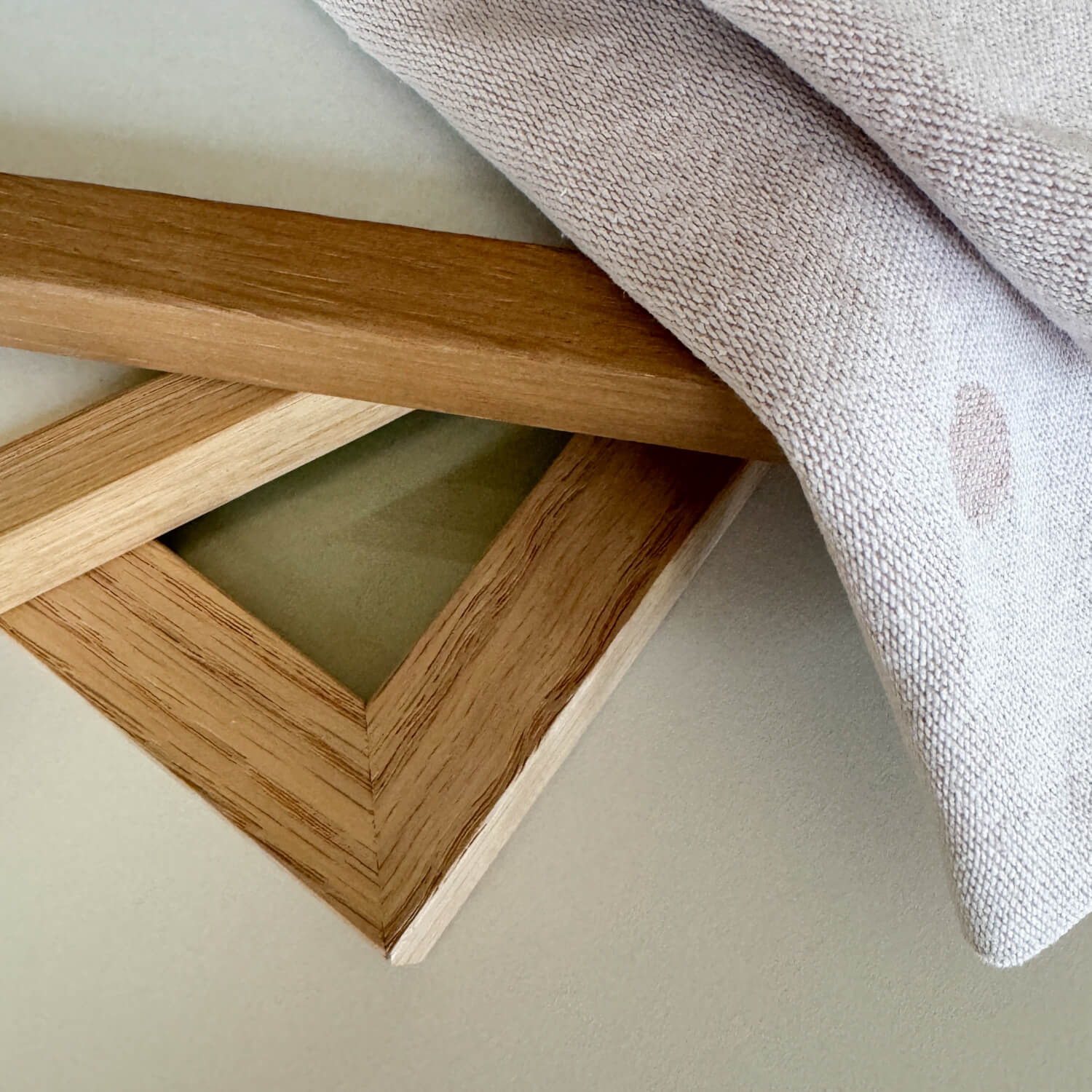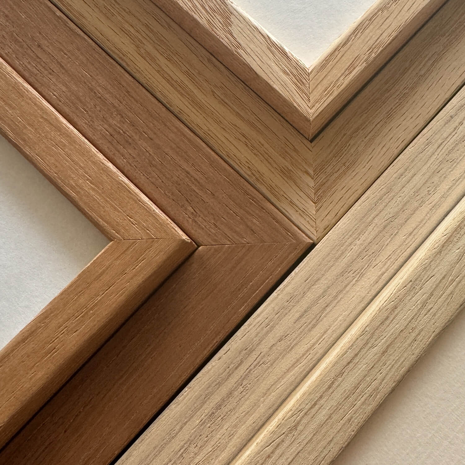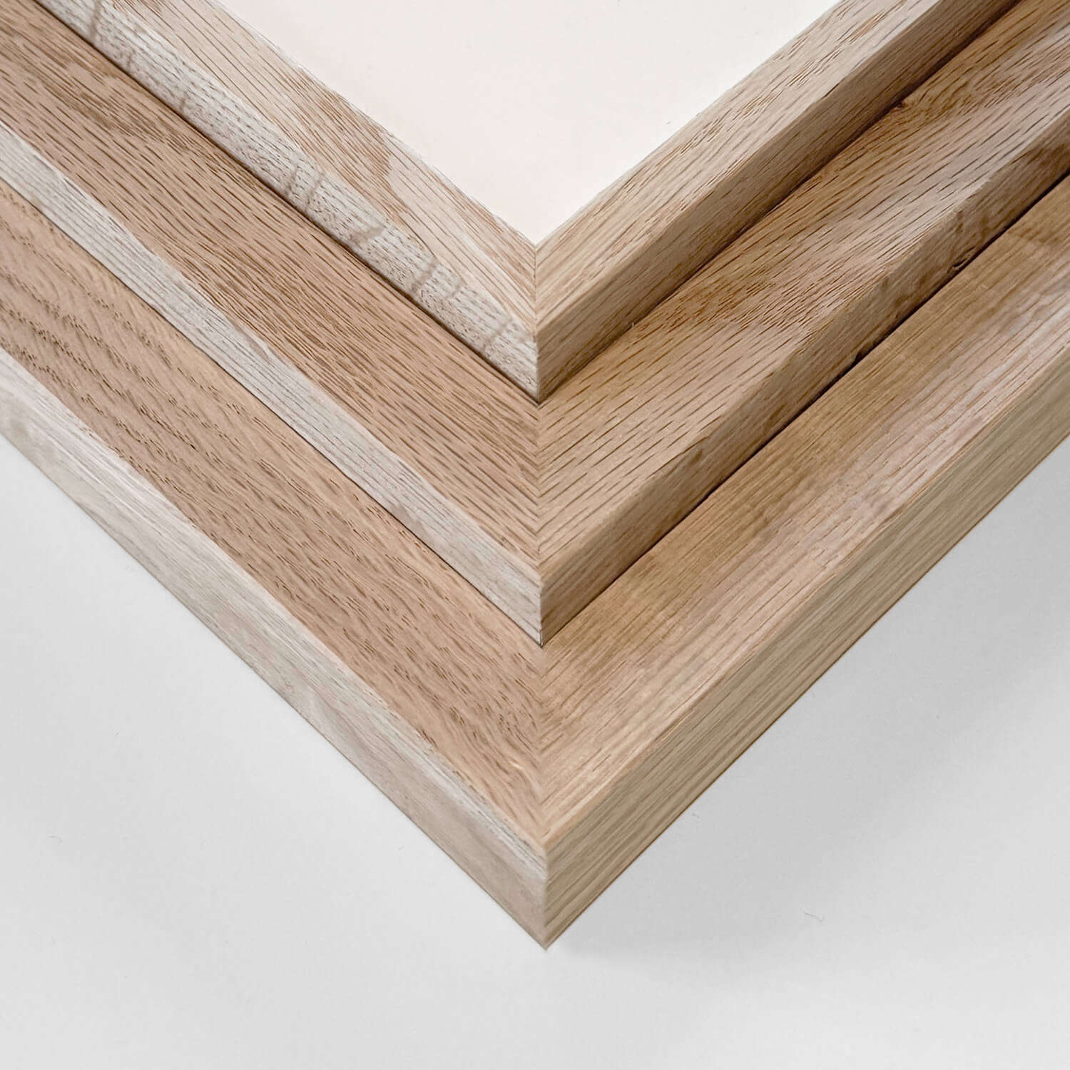 Unsere 20 mm breiten Eichenrahmen können entweder mit 20 mm oder 30 mm Tiefe erworben werden. 20 x 20 mm ist unser beliebtestes Profil bei Eiche, aber alle unsere anderen breiten Holzrahmen sind 30 mm tief, sodass das 20 x 30 mm-Profil am besten geeignet ist, wenn Ihr Eichenrahmen neben einem unserer anderen breiten Rahmen hängen soll.