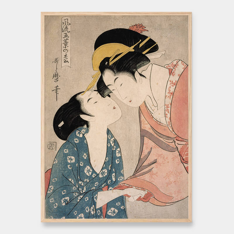 Eleganter Fünf-Nadel-Holzschnitt auf Kiefernholz des japanischen Künstlers Kitagawa Utamaro, der von 1753 bis 1806 lebte. Er ist einer der angesehensten Designer von Ukiyo-e-Holzschnitten und Gemälden und besonders bekannt für diese bijin ōkubi-e - großköpfige Bilder schöner Frauen - aus den 1790er Jahren. Digital verbesserte Version des Originalbildes aus dem Saint Louis Art Museum in den USA.