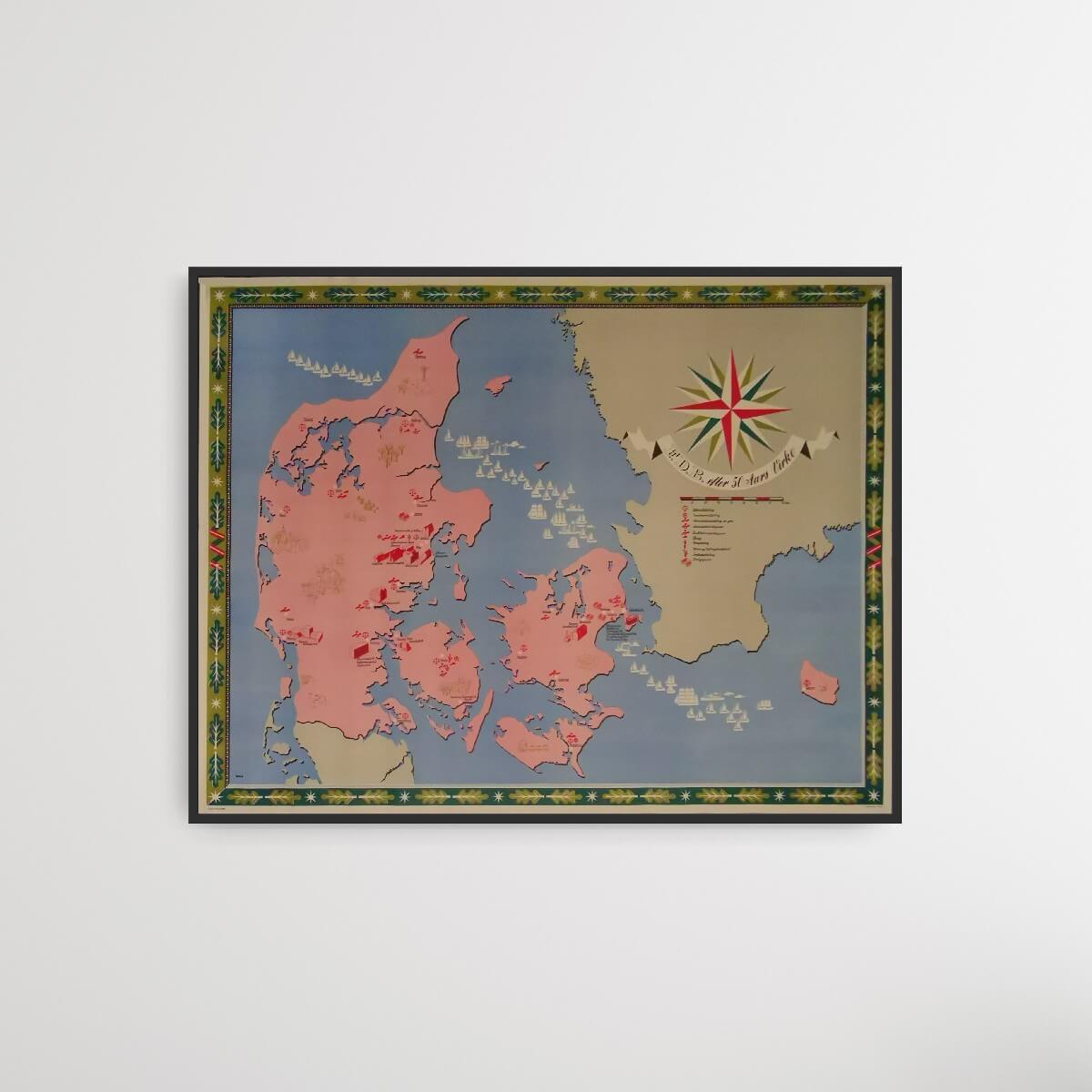 Illustrative Karte von Dänemark von FDB, die ihr 50-jähriges Bestehen feiert. Die dänischen Versorgungsverbände wurden 1896 im Fællesforeningen for Danmarks Brugsforeninger, FDB, vereint und 50 Jahre später veröffentlichten sie dieses Plakat, das 1946 das Jubiläum feierte.