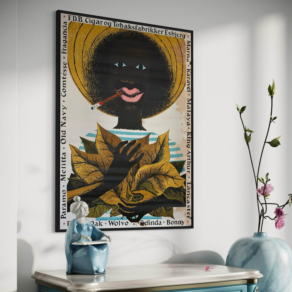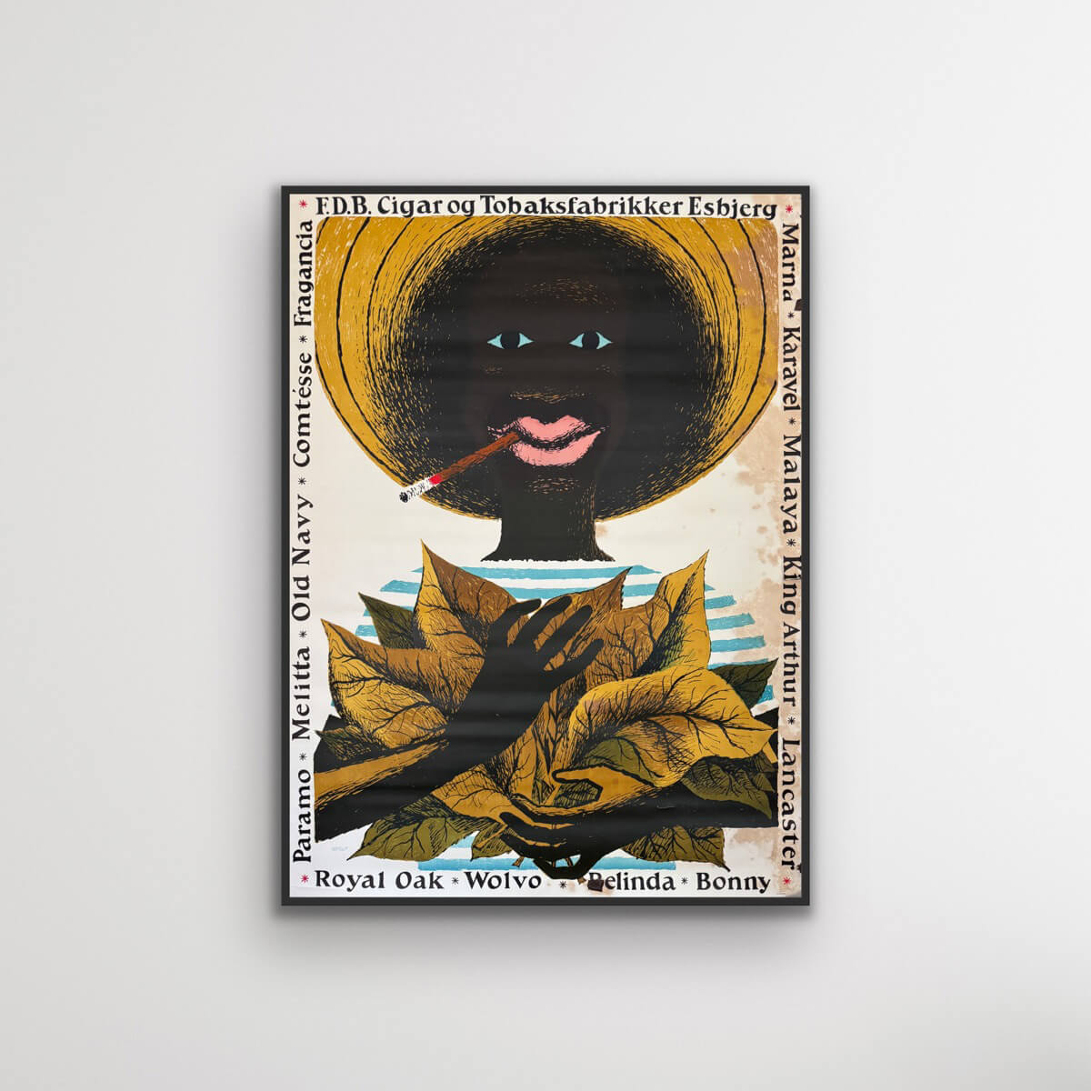Für alle, die klassisches dänisches Design und authentischen Vintage lieben. Dieses originale Werbeplakat der FDB Zigarren- und Tabakfabrik in Esbjerg ist ein fantastisches Stück dänischer Werbegeschichte. Entworfen 1949 vom renommierten Künstler Paul Høyrup und gedruckt als Lithografie in wunderschönen, leuchtenden Farben.