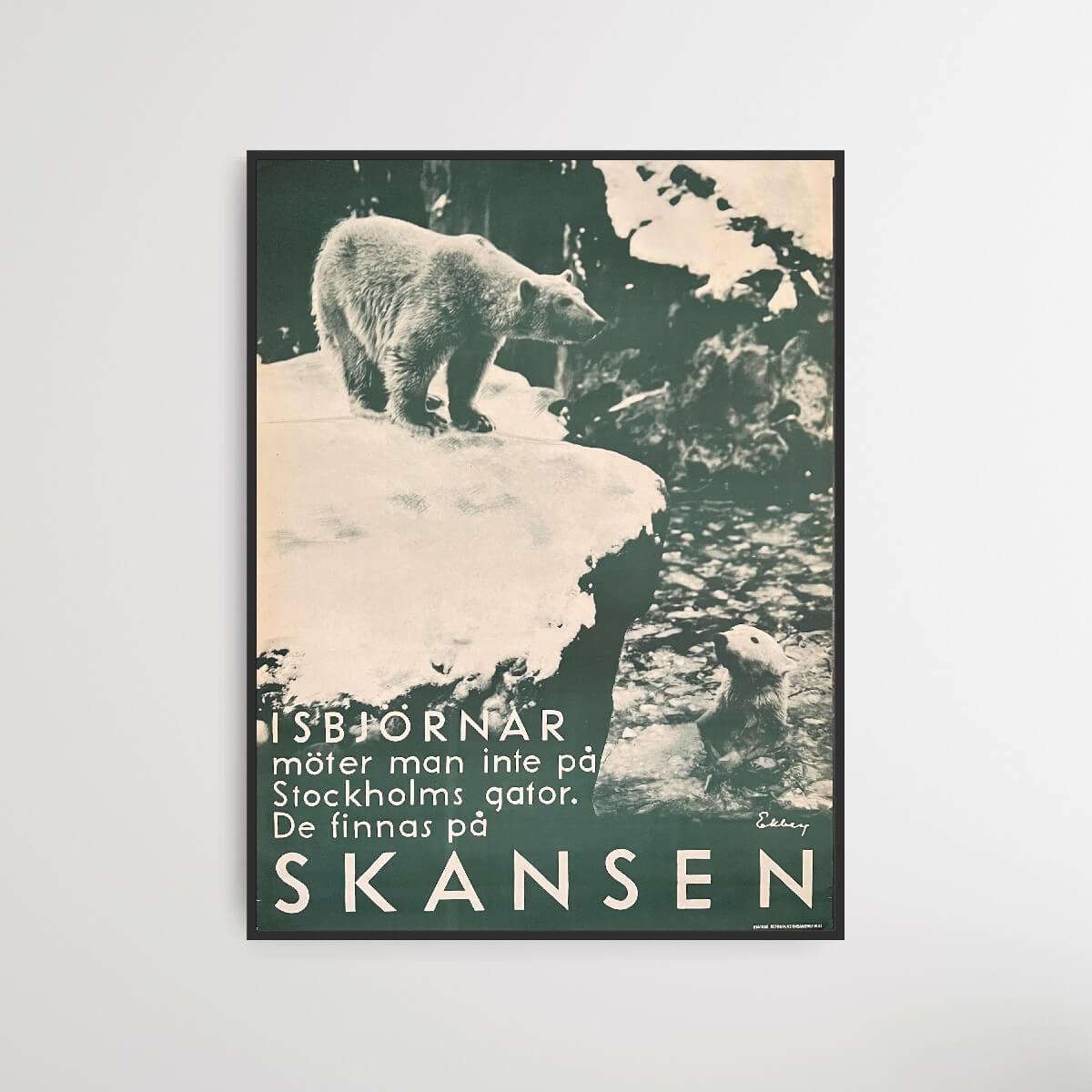 Schwedisches Reiseplakat von Ekberg aus dem Jahr 1935, das mit dem Text für den schwedischen Zoo Skansen wirbt: „Eisbären sind auf den Straßen von Stockholm nicht zu finden. Sie werden bei Skansen gefunden“, was bedeutet: Eisbären findet man nicht in den Straßen von Stockholm. Sie werden bei Skansen gefunden.