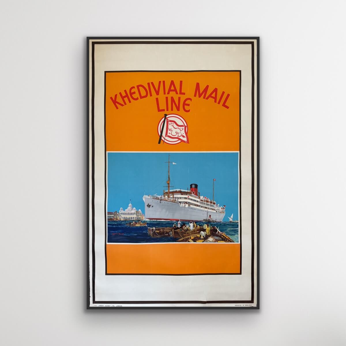 Sehr seltenes originales Vintage-Plakat in Orange und Blau der Khedivial Mail Line, einer Dampfschifffahrtsgesellschaft, die Schiffe von Alexandria, Ägypten aus betrieb. Das genaue Gründungsdatum des Unternehmens ist nicht bekannt, dürfte aber in der zweiten Hälfte des 19. Jahrhunderts liegen.