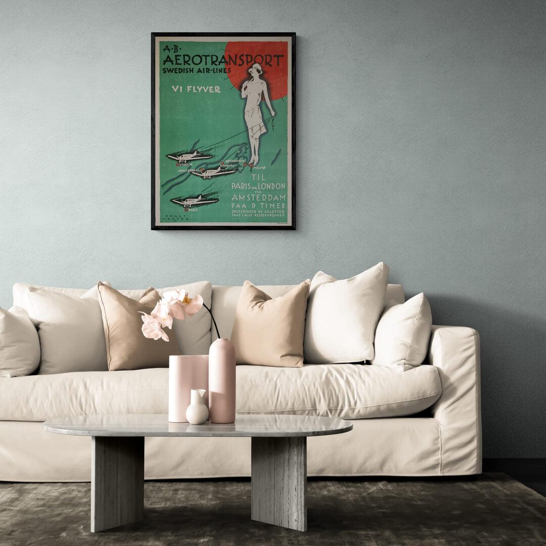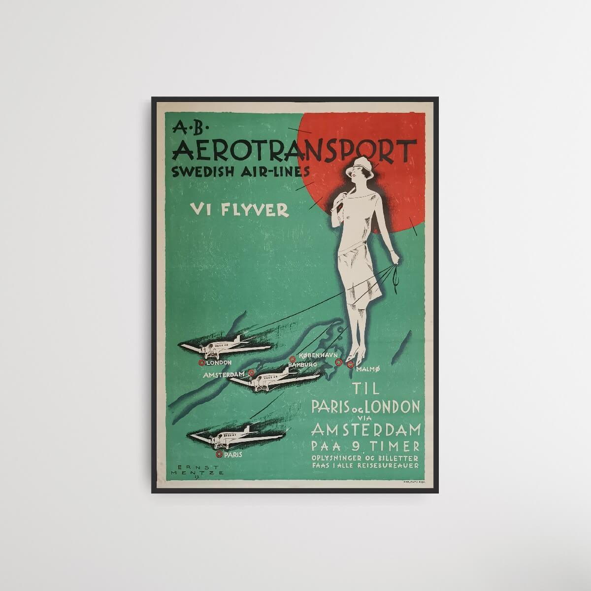 Sehr schönes lithografisches Flugzeugplakat aus dem Jahr 1927, herausgegeben von der schwedischen Fluggesellschaft AB Aerotransport. Das Poster trägt den Text We fly to Paris and London via Amsterdam in 9 hours , was wirklich das Alter dieses Posters bezeugt und es interessanter und unterhaltsamer macht. Das Plakat trägt auch die Städtenamen Malmö, Kopenhagen und Hamburg.