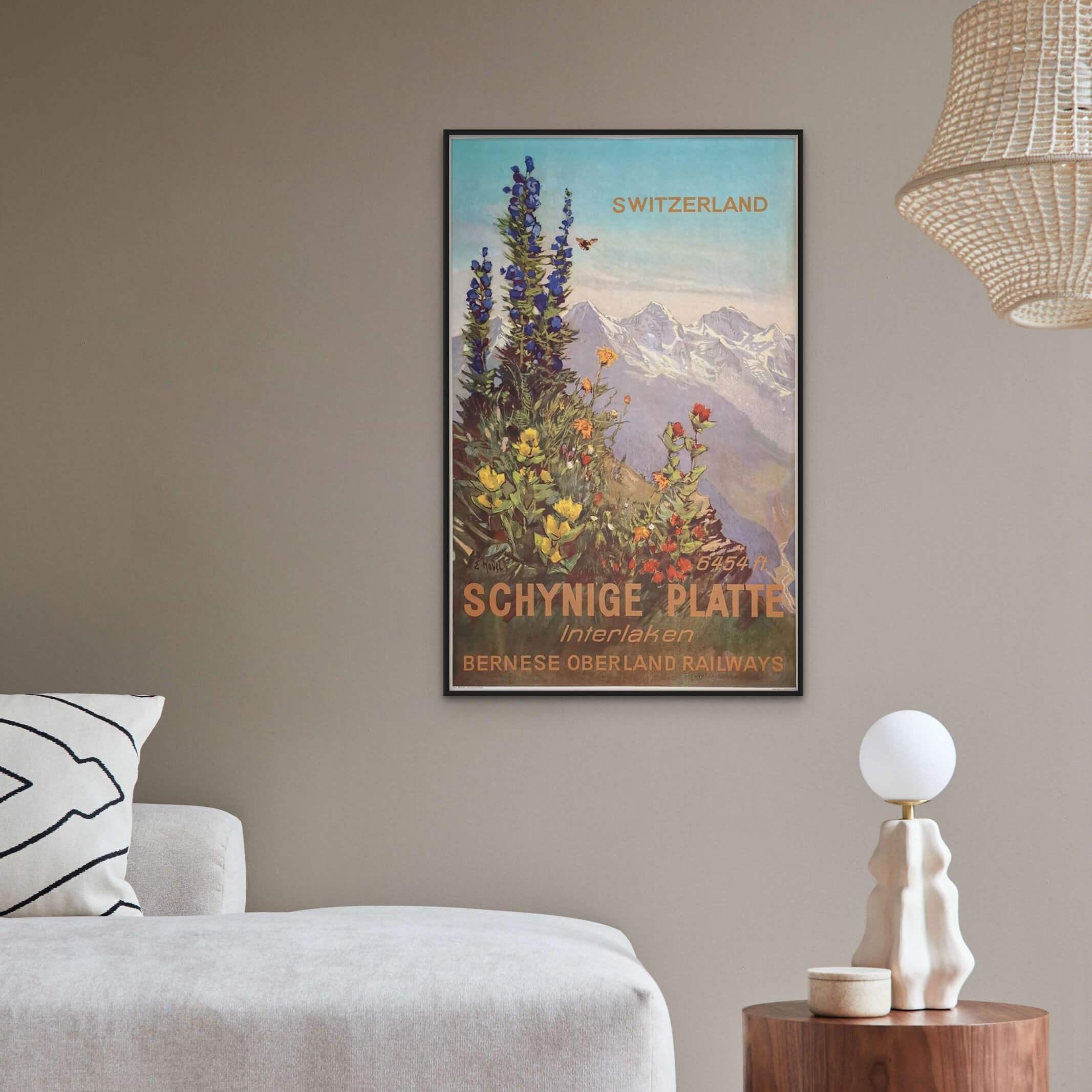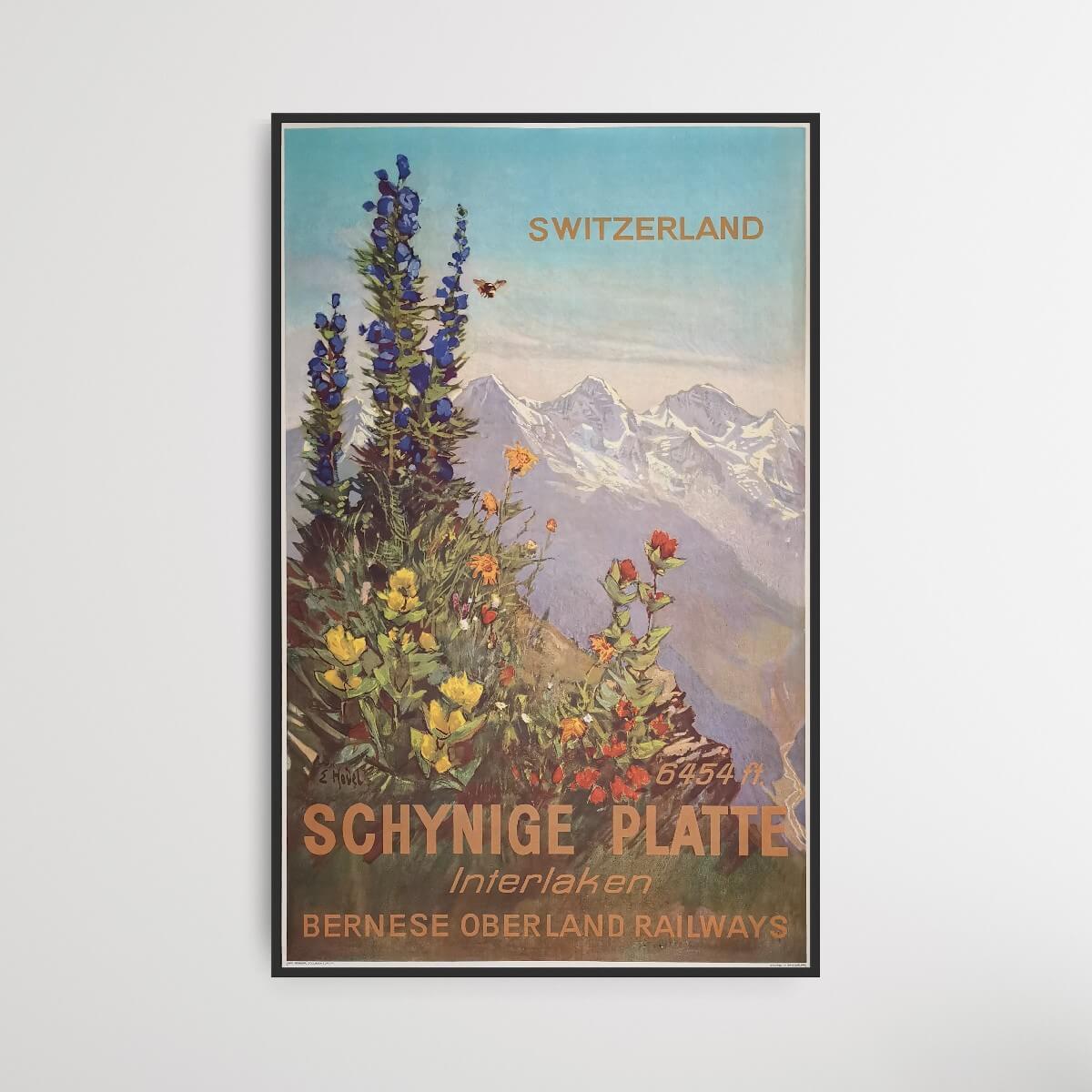 Schweizer Reiseplakat von 1952 von Ernst Hodel. Das Poster zeigt einige schöne Blumen mit einer Biene im Vordergrund und die majestätischen Schweizer Berge im Hintergrund. Das Poster hat etwas Patina, ist aber ansonsten in einwandfreiem Zustand - sehr nahe an 10/10. Dieses Poster ist nicht so selten wie viele unserer anderen Poster, aber wir haben es noch nie in einem so guten Zustand gesehen.