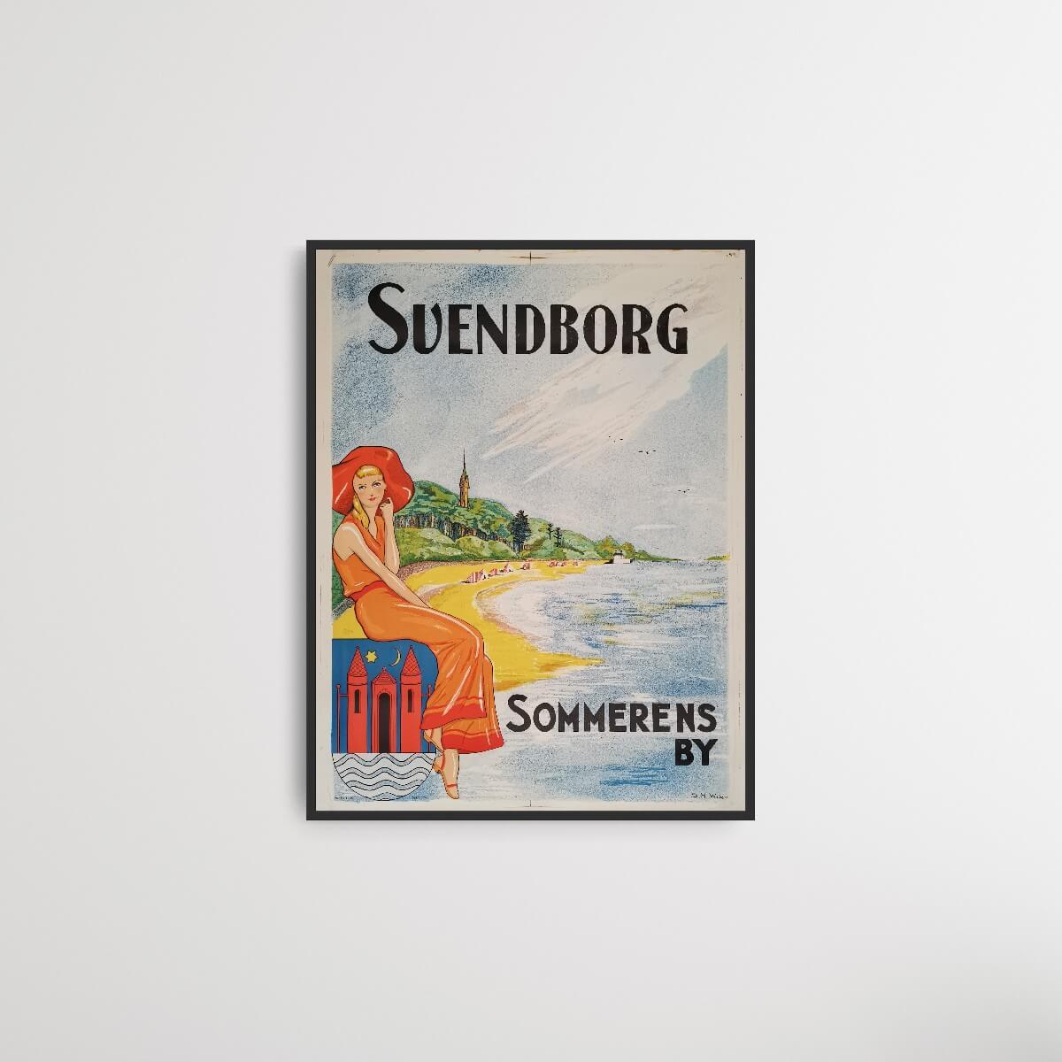 Dänisches Reiseplakat aus den 1950er Jahren, das für die schöne Stadt Svenborg auf Fünen wirbt. Sie finden dieses Poster nirgendwo anders im Internet. Poster hat nur wenige Linien an den Seiten und einige unbedeutende Falten, die in einem richtigen Rahmen verschwinden.