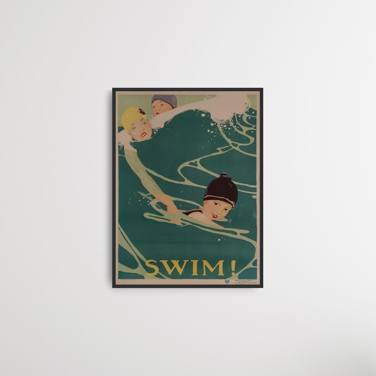 Schwimmen! ist ein nettes kleines lithografisches Poster, herausgegeben vom Büro für Sozialerziehung National Board der Young Women Christian Associations . Das Poster wurde von der amerikanischen Künstlerin, Feministin und Pazifistin Anita Parkhurst (1892 - 1984) entworfen und zeigt zwei Frauen und ein Kind, die über eine Welle im Ozean schwimmen.
