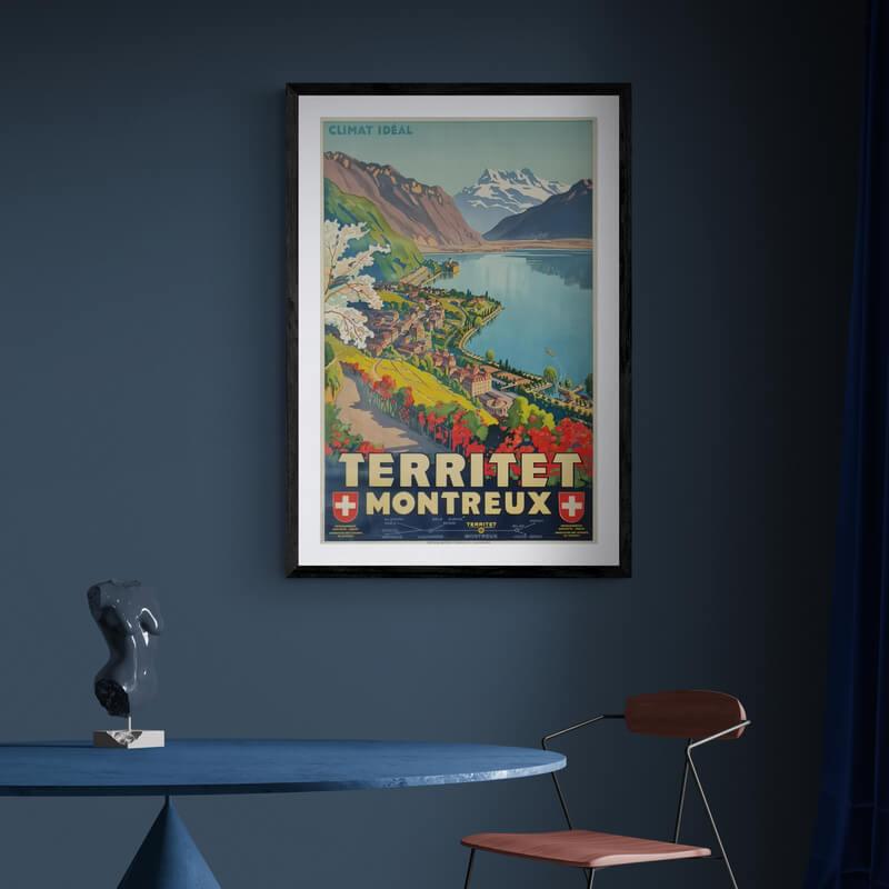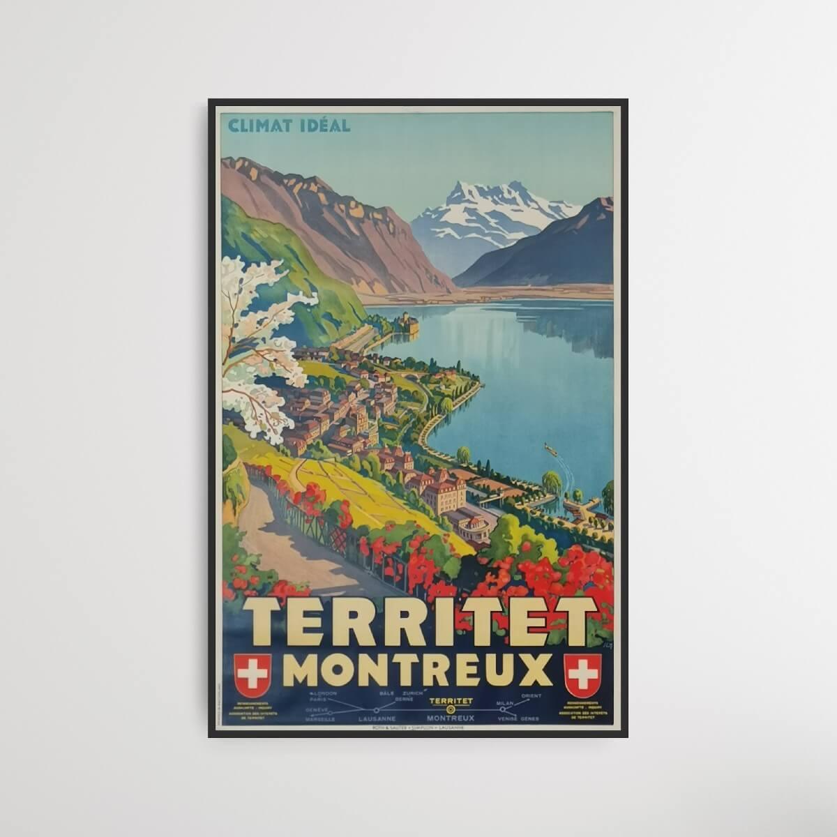 Schweizer Plakate gehören zu den wertvollsten, daher ist dieses Plakat ein absoluter Fund - besonders in diesem Zustand! Es ist ein Zugplakat, das dafür wirbt, dass Sie zwischen Territet und London, Paris, Genf, Marseille, Lausanne, Basel, Zürich, Bern, Mailand, Venedig, Gènes und dem Orient reisen können.