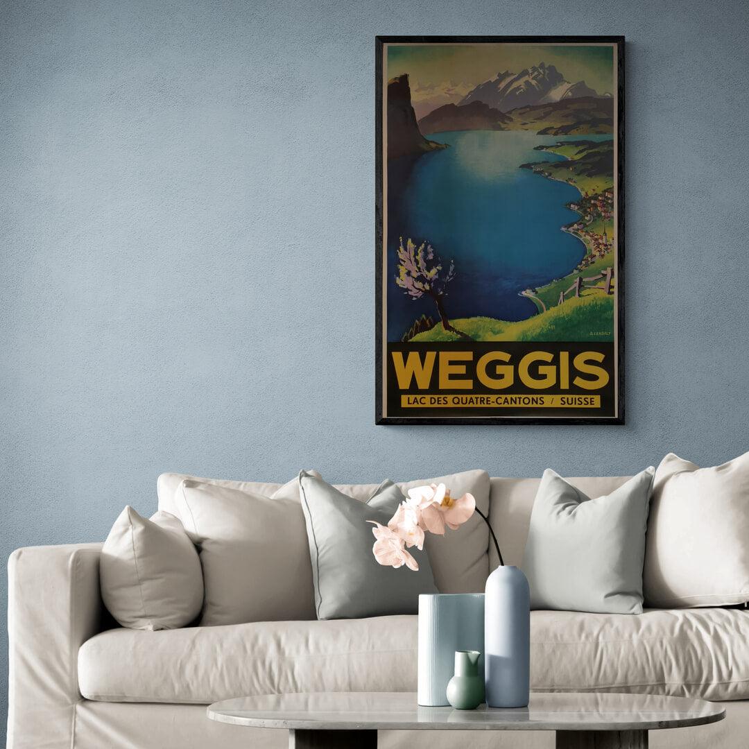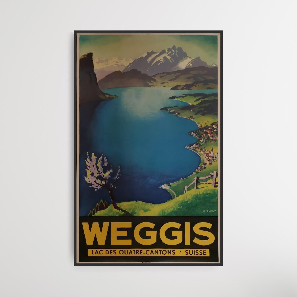 Sehr schöne Schweizer Lithografie von 1938 zur Förderung des Fremdenverkehrs in Weggis am Vierwaldstättersee am Südwestfuss der Rigi. Die Gegend hat ein besonders mildes Klima und ist bekannt für die Blüte zahlreicher südlicher Pflanzen.
